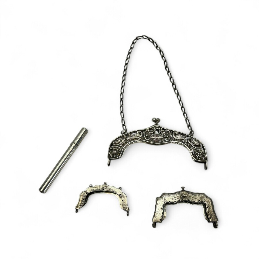 Lot divers zilver: twee kleine tweede gehalte (835/1000) zilveren beursbeugels, één 20e eeuwse opengewerkte beursbeugel en een antieke zilveren naaldenkoker.