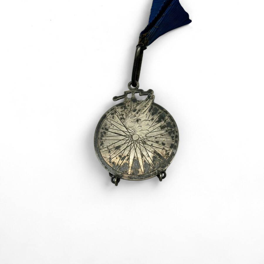 Een antieke tweede gehalte (835/1000) zilveren vroege Fiets medaille aan een blauw lint. Van de DSVC uit 1898. Met een gegraveerde voorstelling van een fietswiel met vleugel. Op de achterzijde v...