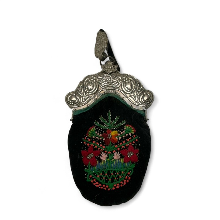 Een 20e eeuwse tweede gehalte (835/1000) zilveren tasbeugel. Gedreven decor van bloemen, gecontourneerd en aan de bovenzijde knop in de vorm van een gegoten schildje. Aan de achterzijde met init...
