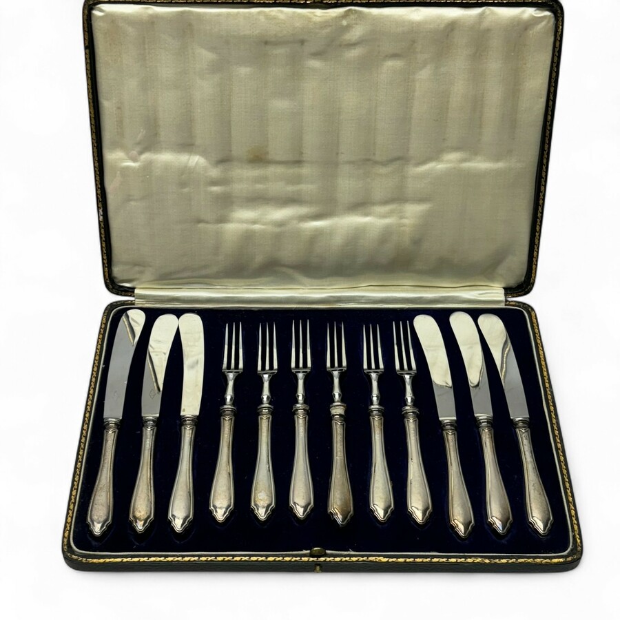 Cassette gevuld met zes vorkjes en messen, allen met eerste gehalte (925/1000) Engels zilveren heften. Sheffield, 1927, meesterteken RP
