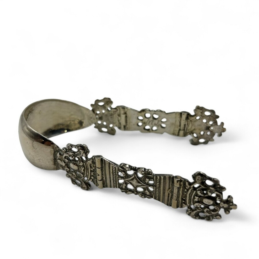 Een tweede gehalte (835/1000) zilveren klontjestang, gemaakt van een antiek Bijbelslot, met initialen 'ML' en datering '1804'.