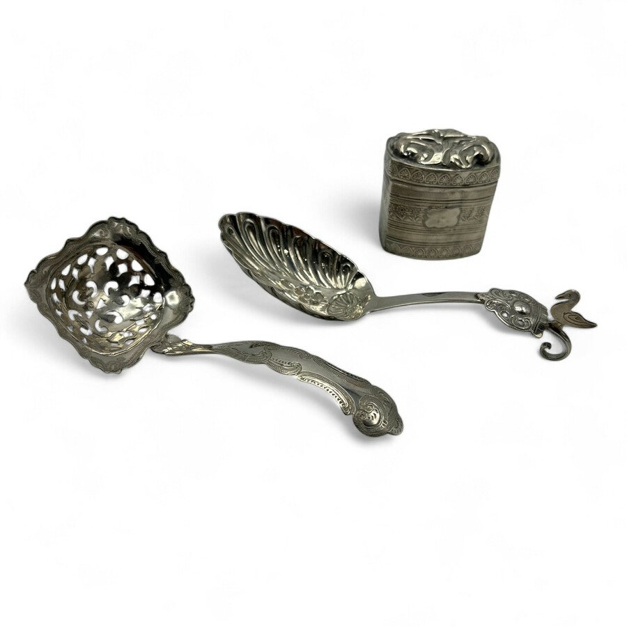 Lot divers antiek 19e eeuws tweede gehalte (835/1000) Nederlands zilver: een roomlepel, met schelpmotieven in de bak, bekroond met schildje en vogel, mr. 77B = Brunings, Joure., een 19e eeuws ge...
