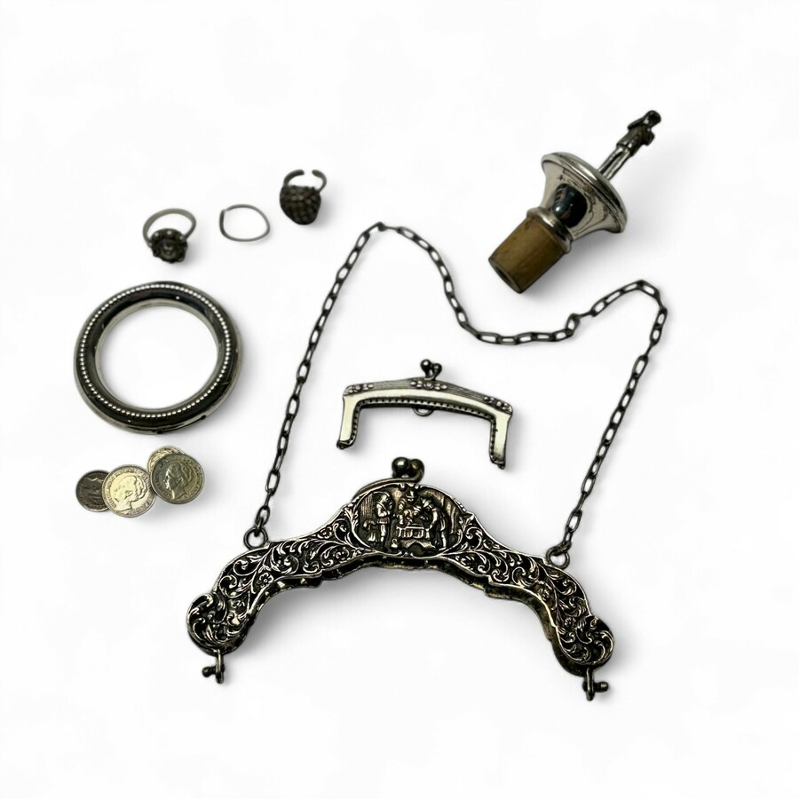 Lot divers zilver, waaronder een tweede gehalte (835/1000) zilveren tasbeugel, opengewerkt met herbergdecor, een zilveren flessenstop bekroond met man met instrument en een zilveren beursbeugelt...