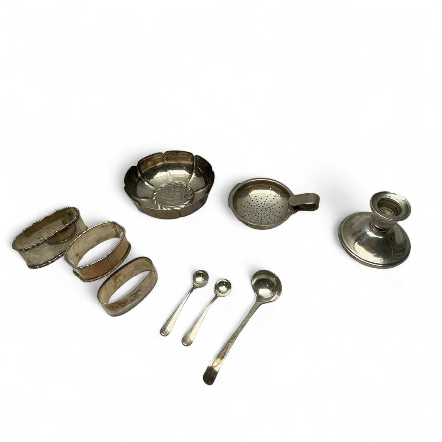 Lot zilver, diverse gehaltes: tweede gehalte zilveren theezeef op uitlekbakje, gemerkt met wandelende leeuw, meesterteken 'v.G.4', vermoedelijk G.F.H. van Geelen, Schoonhoven, jaarletter 1944, t...