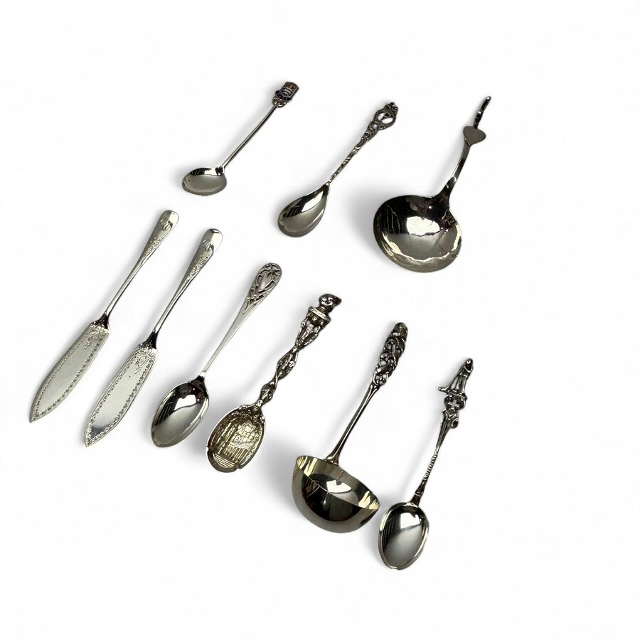Lot divers eerste (925/1000), tweede (835/1000) en derde gehalte zilveren schepwerk, o.a. een 19e eeuwse Nederlandse roomlepel, souvenirlepel Zwitserland en twee Engelse botermesjes.