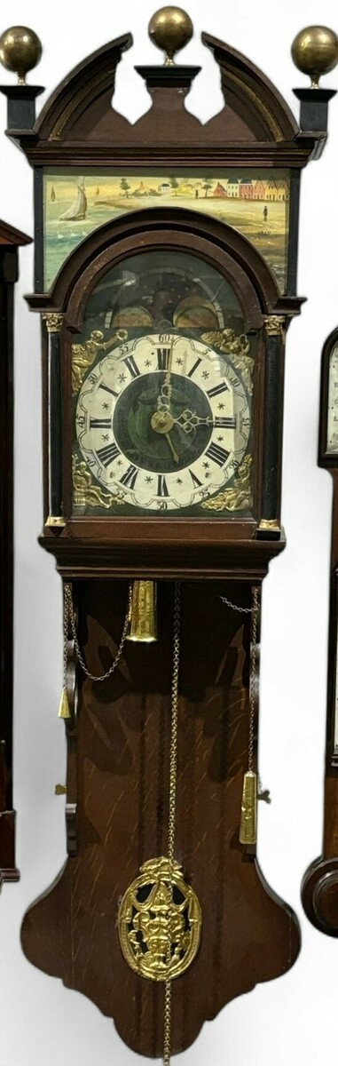 Friese staartklok in eiken kast met dubbele kap, 19e eeuw