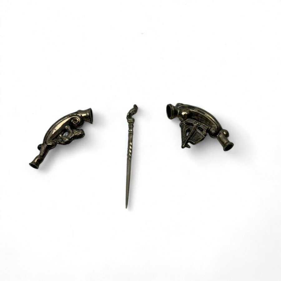 Twee antieke tweede gehalte (835/1000) zilveren sigarettenpijpjes met schip en leeuw, 19e eeuws. Hierbij een tweede gehalte (835/1000) zilveren een pijpenpluizer bekroond met ooievaar, mr. Van d...