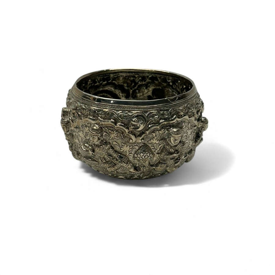 Een India's gedreven zilveren offerschaaltje. Zeer fijn gedreven met decors van diverse figuren rondom. Op de onderzijde een gravering van een vogel op tak. vroeg 20e eeuws.