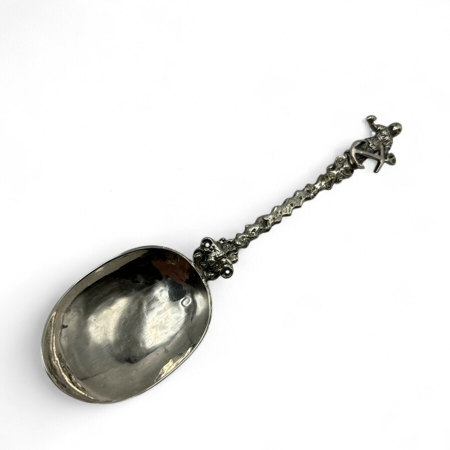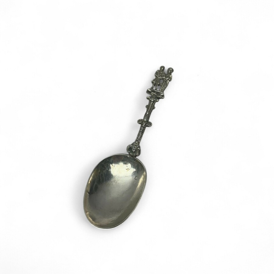 Een 18e eeuwse zilveren gelegenheidslepel. Steel bekroond met geloof, hoop en liefde. Met gegraveerde datering 1748. Onduidelijk Mr. teken.
