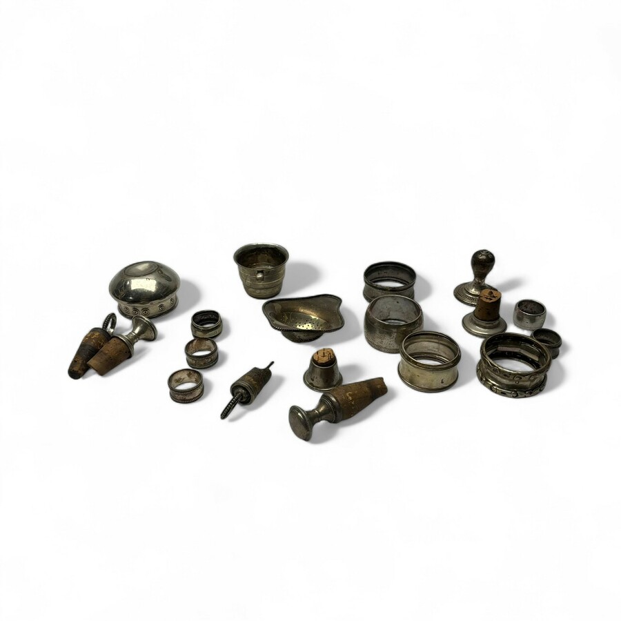 Lot divers zilver en verzilverd, waaronder servetringen, kurken en een tweede gehalte (835/1000) zilveren theezeefje op lekbakje