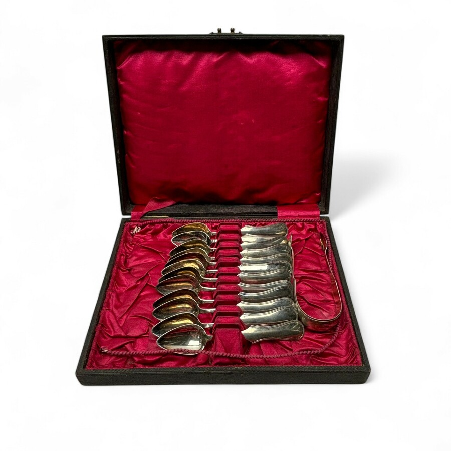 Twaalf tweede gehalte (835/1000) zilveren theelepels en een suikertang in geschenkdoos