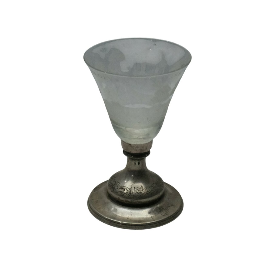 Een antiek 18e eeuws gelegenheidsglas met radgravure van een theekoepel en vee, met tekst 'T Groeyen en Bloeyen van Ossen en Koeyen'. Op 19e eeuwse tweede gehalte (835/1000) zilveren voet.