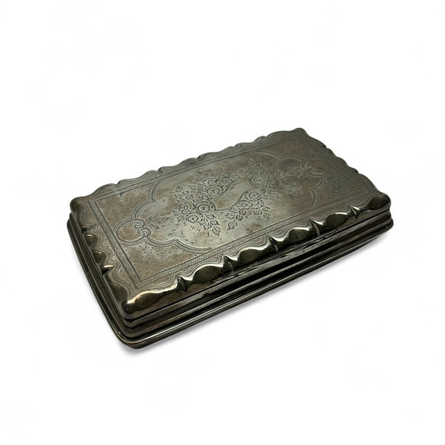 Een antieke 19e eeuwse tweede gehalte (835/1000) zilveren tabaksdoos, gegraveerd met o.a. bloemmotieven.
