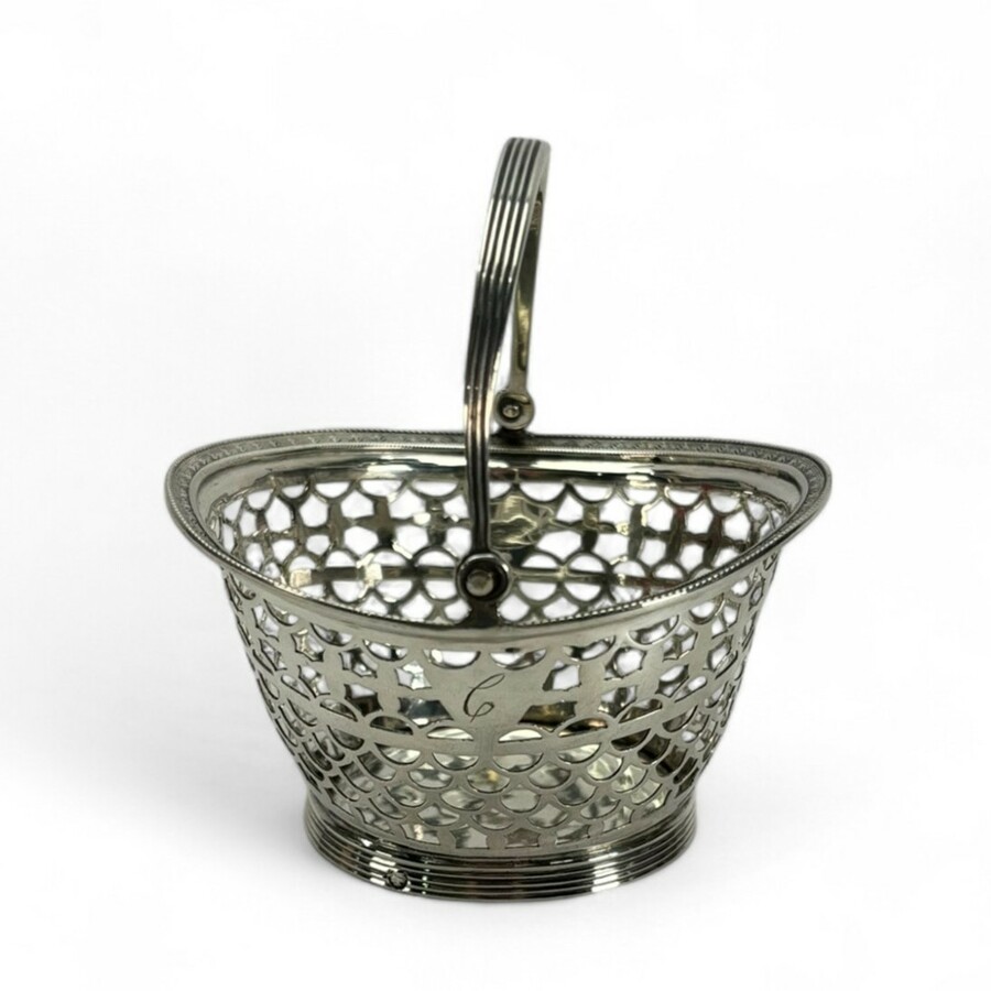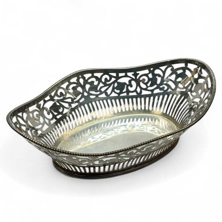 Een 20e eeuws eerste gehalte (925/1000) zilveren bonbonmandje, ajour gezaagd, met gecontourneerde rand versierd met parelrand. Gemerkt DA+ = Aubert, Den Haag
