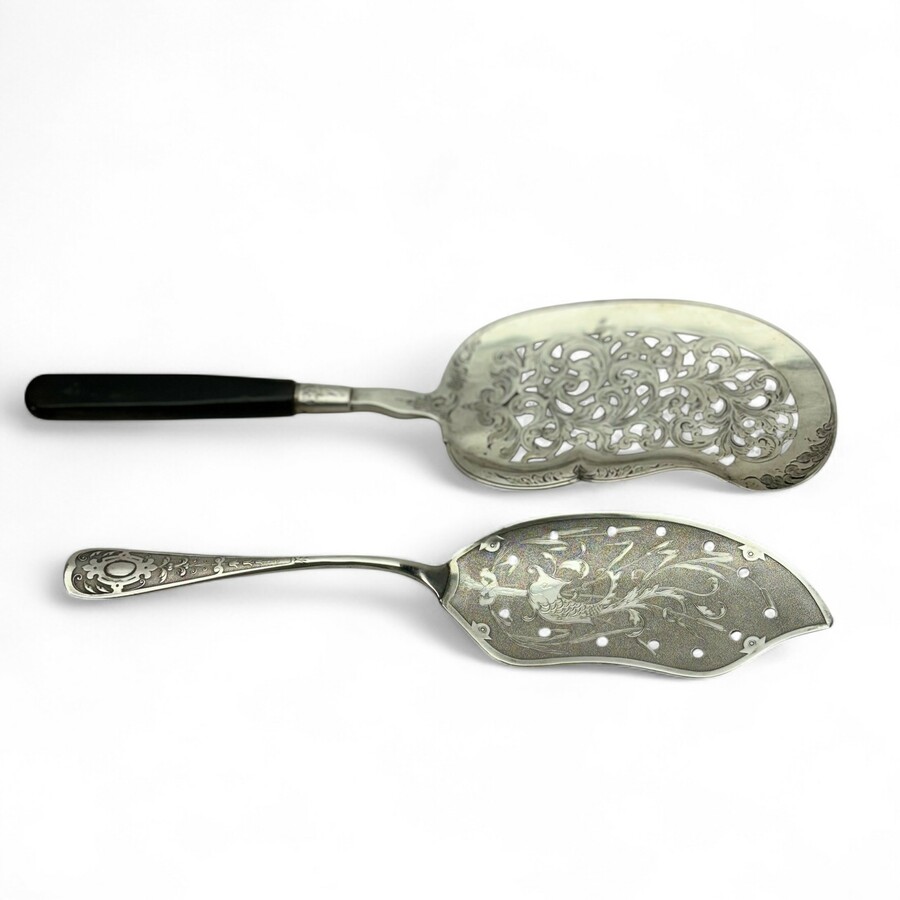 Twee met graveerwerk versierde zilveren visscheppen