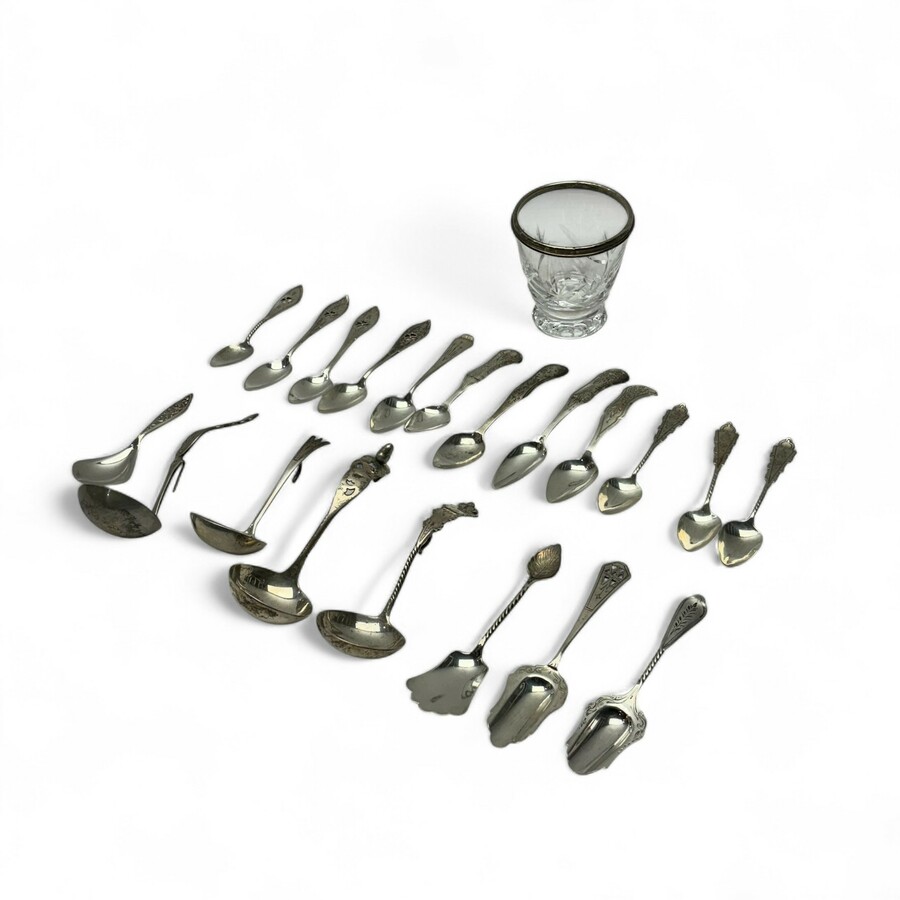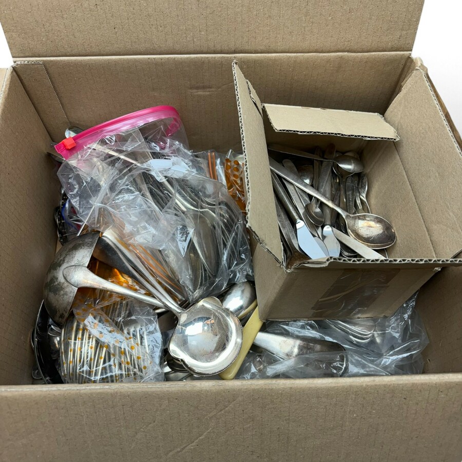 Een groot lot met divers verzilverd bestek en schepwerk. Bestaand uit diverse dienlepels en kleinbestek.