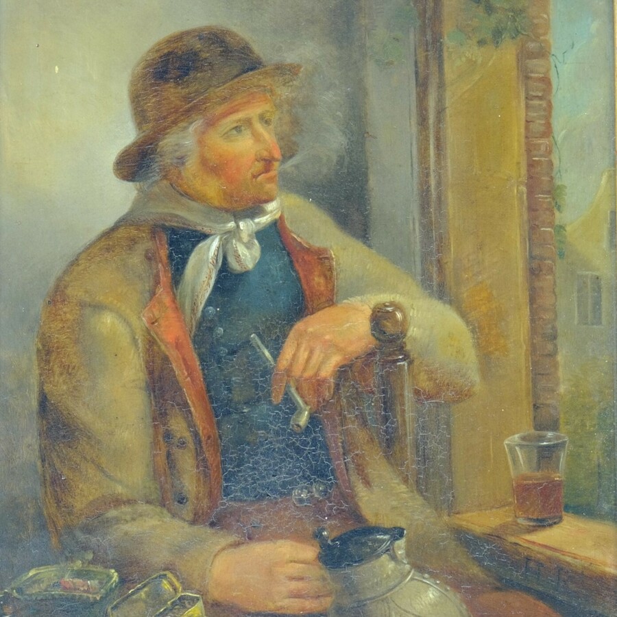 Schilderij, olieverf op paneel. Pijprokende man bij raampartij met aardewerken kruik. Rechtsonder gemonogrammeerd ‘HR’ = Henricus Engelbertus Reijntjes (Amsterdam 1817-1900). Herkomst: Grijpma G...