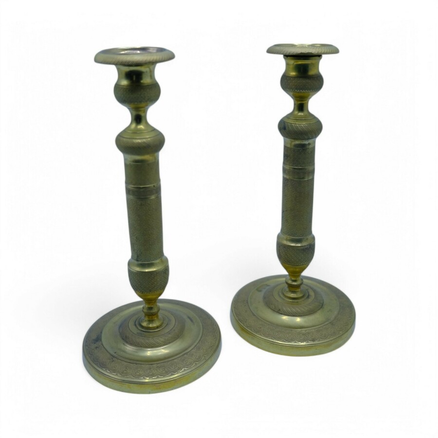 Twee antieke vroeg 19e eeuwse vuurvergulde bronzen kandelaars, Empire, met bobeches.