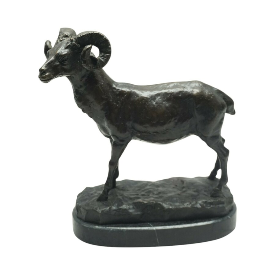 Een gepatineerd bronzen sculptuur van een steenbok. Op een ovale natuurstenen sokkel. 20e eeuws.