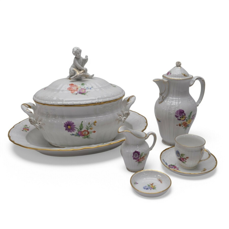 Lot diverse onderdelen van een servies, waaronder een grote terrine met schaal, bekroond met putti, melkkan en theepot. Allen gedecoreerd met gouden bies en beschilderd met bloemen en vlinders, ...