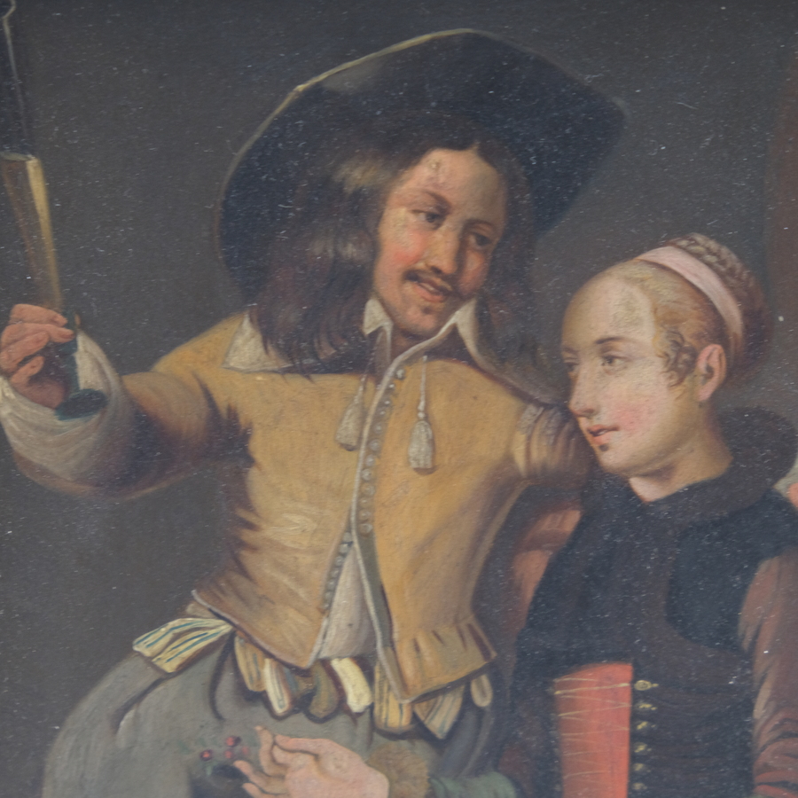 Schilderij, olieverf op paneel. Voorstelling van een man en vrouw in 17e eeuwse stijl. Ongesigneerd.