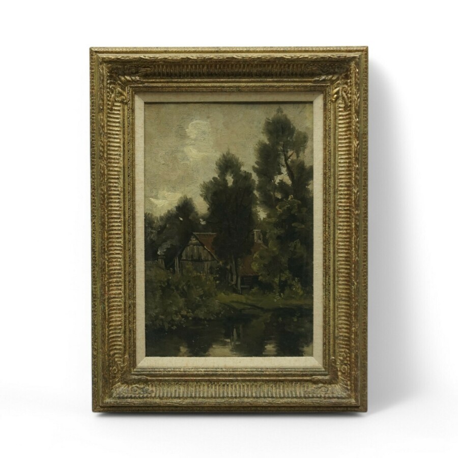 Schilderij, olieverf op paneel. Gezicht op een huisje aan het water. Rechtsonder gesigneerd Willem Cornelis Rip (Rotterdam 1856 – Den Haag 1922). In fraaie profiellijst.