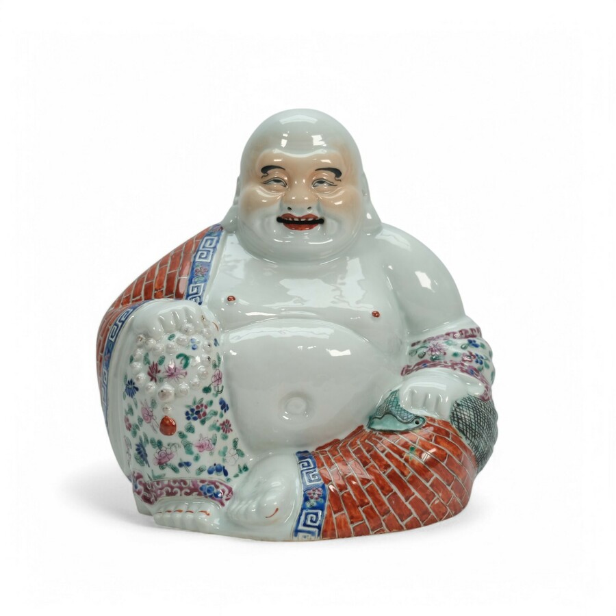 Een antieke Chinees porseleinen boeddha, ca. 1900, met Famille Rose emaille beschildering. Gemerkt aan de onderzijde. In goede staat.