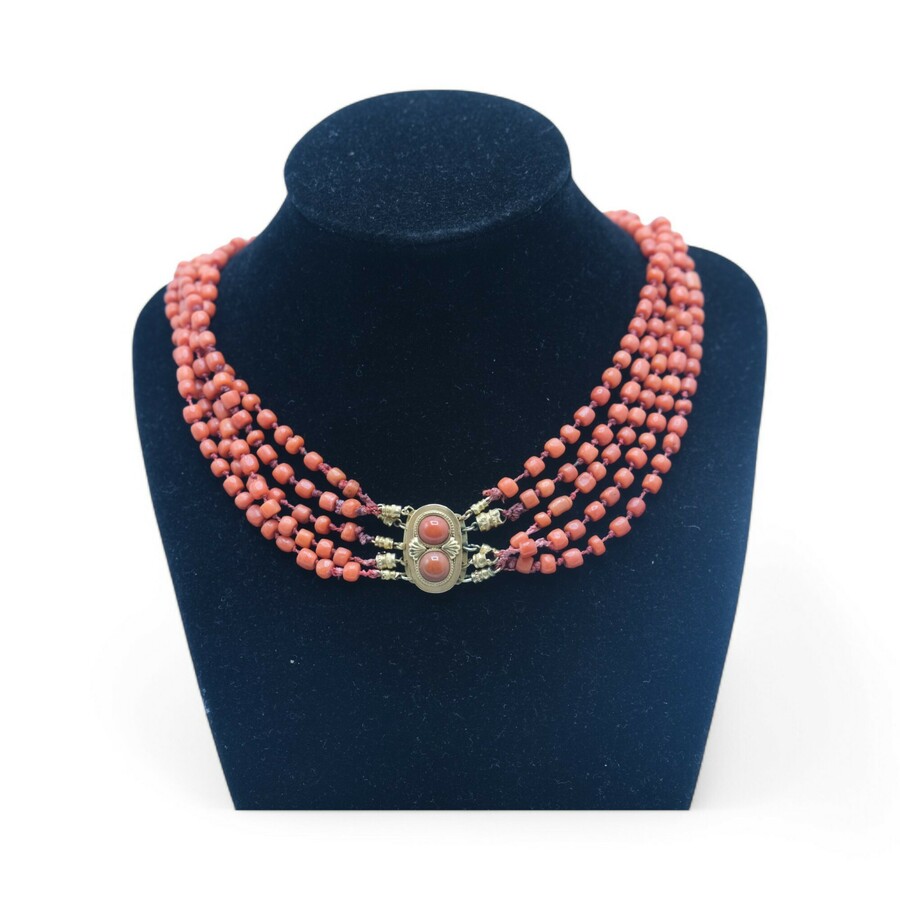 Een antiek 19e eeuws Vijfrijig bloedkoralen collier met 14 karaats (585/1000) geelgouden slot, bezet met twee cabuchon geslepen bloedkoralen