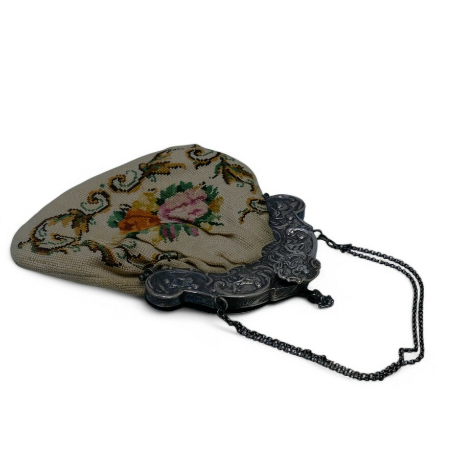 Ee antieke 18e eeuwse gecontourneerde zilveren tasbeugel met gedreven decors, aan geborduurde tas. Beugel met inscriptie en meesterteken ‘LO’.