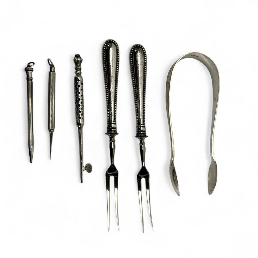 Lot divers zilver: een tweede gehalte (835/1000) zilveren klontjestang, gegraveerd, twee vleesvorkjes met derde gehalte (800/1000) zilveren greep met parelrand, een tweede gehalte zilveren tambo...
