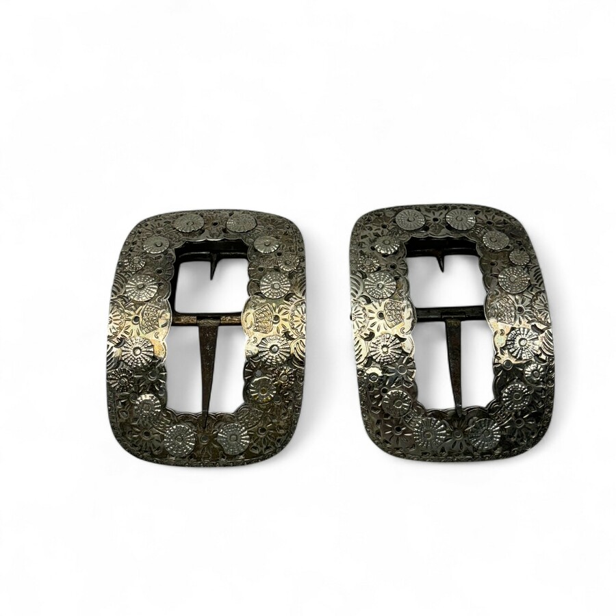 Lot van twee tweede gehalte (835/1000) zilveren schoengespen, gedecoreerd met bloemmotieven. Gekeurd met leeuw, minervakop en jaarletter N (1948). Mr JV = Verkerk/Pluut, Schoonhoven.