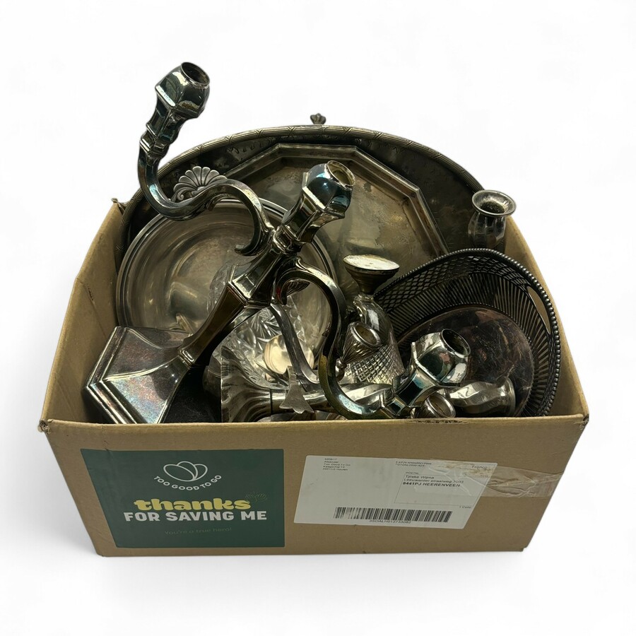 Lot met diverse verzilverde artikelen. bestaande uit kandelaars, schepwerk. Enkele stukken kristal met tweede gehalte (835/1000) zilveren voetjes.