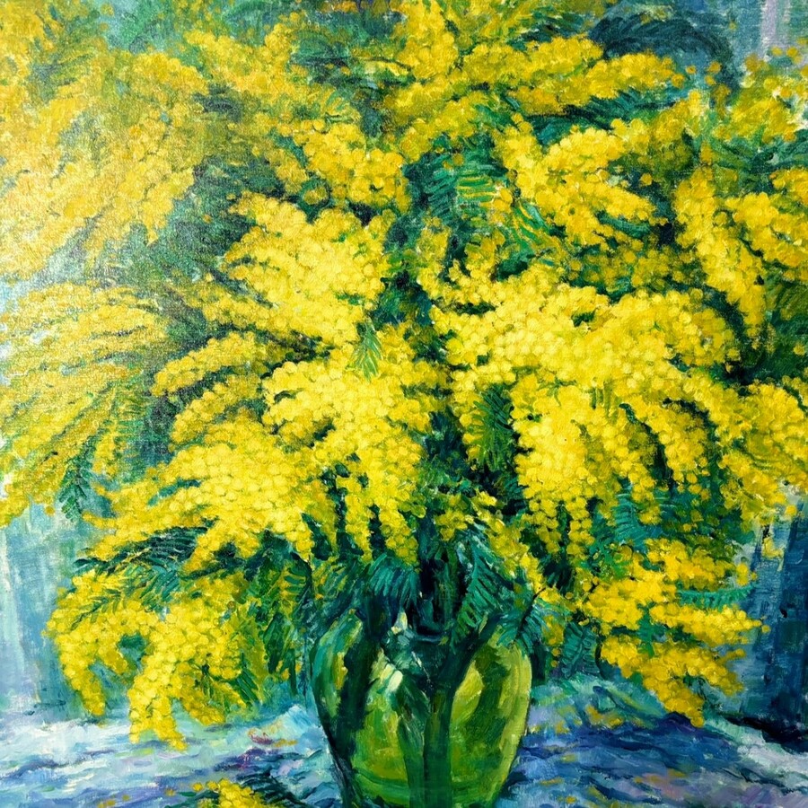 Schilderij, olieverf op doek. Bloemstilleven in geel en blauw. Rechtsonder gesigneerd Lies Viegers (Nijmegen 1922 - 2012).