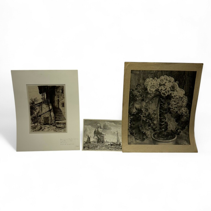 Lot van drie kunstwerken: een ets, schepen op de Maas bij Rotterdam, door Ludolf Bakhuizen (1630-1708), een ets, trap bij huisje, door Maria van Hohenzollern-Sigmaringen (Sigmaringen 1845 - Brus...