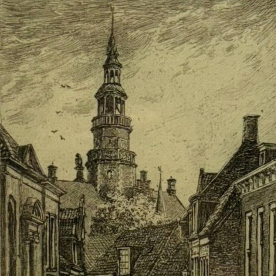 Ids Wiersma (1878-1965). Ets op papier. Straat met huifkar en kerktoren in de achtergrond. Gesigneerd in de plaat en met potlood.
