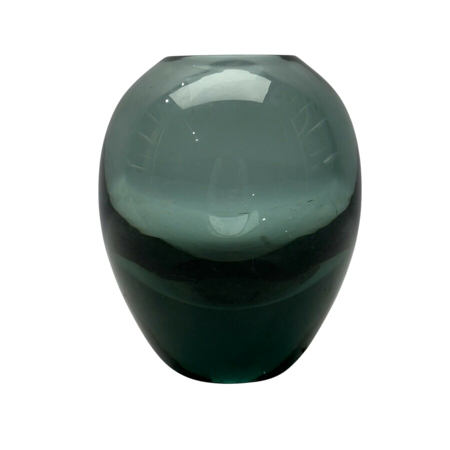 Een 20e eeuwse dikwandige blauwe vaas, ontwerp A.D. Copier voor glasfabriek Leerdam, ca. 1935. Aan de onderkant gemerkt met etsmerk.