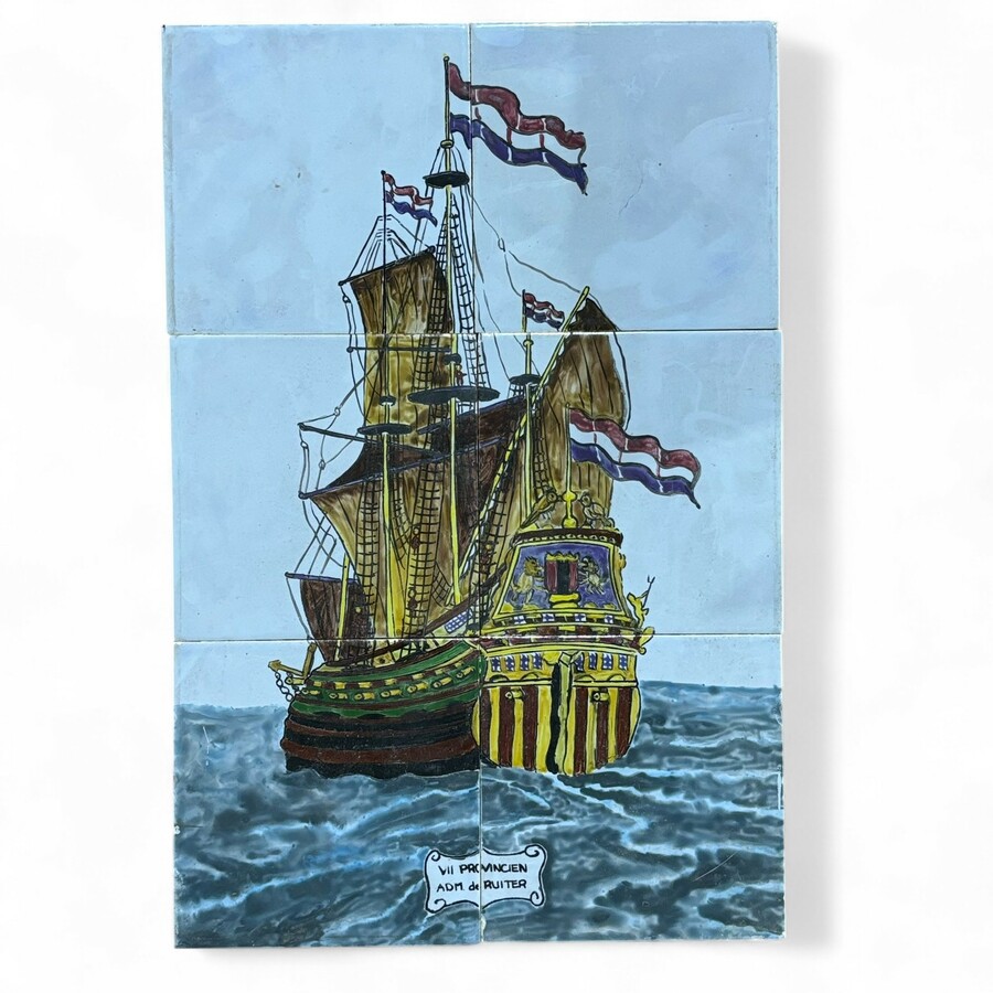 Een 20e eeuws zespas tegeltableau, polychroom decor van een 17e eeuws schip. Met opschrift ‘VII Provincien Adm. De Ruiter’.