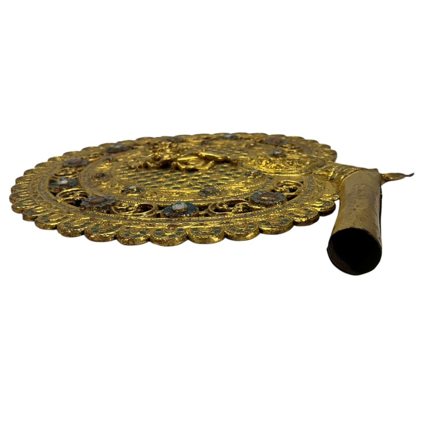 Een 20e eeuwse met glasstenen ingelegde en vergulde metalen waaier. Rond model, met centraal een dierfiguur. Birma, 20e eeuw.