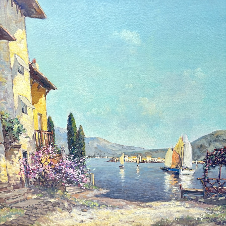 Schilderij, olieverf op doek. Mediterraanse zomerdag met huisje aan het meer. Linksonder gesigneerd Alfredo Caldini (1917)