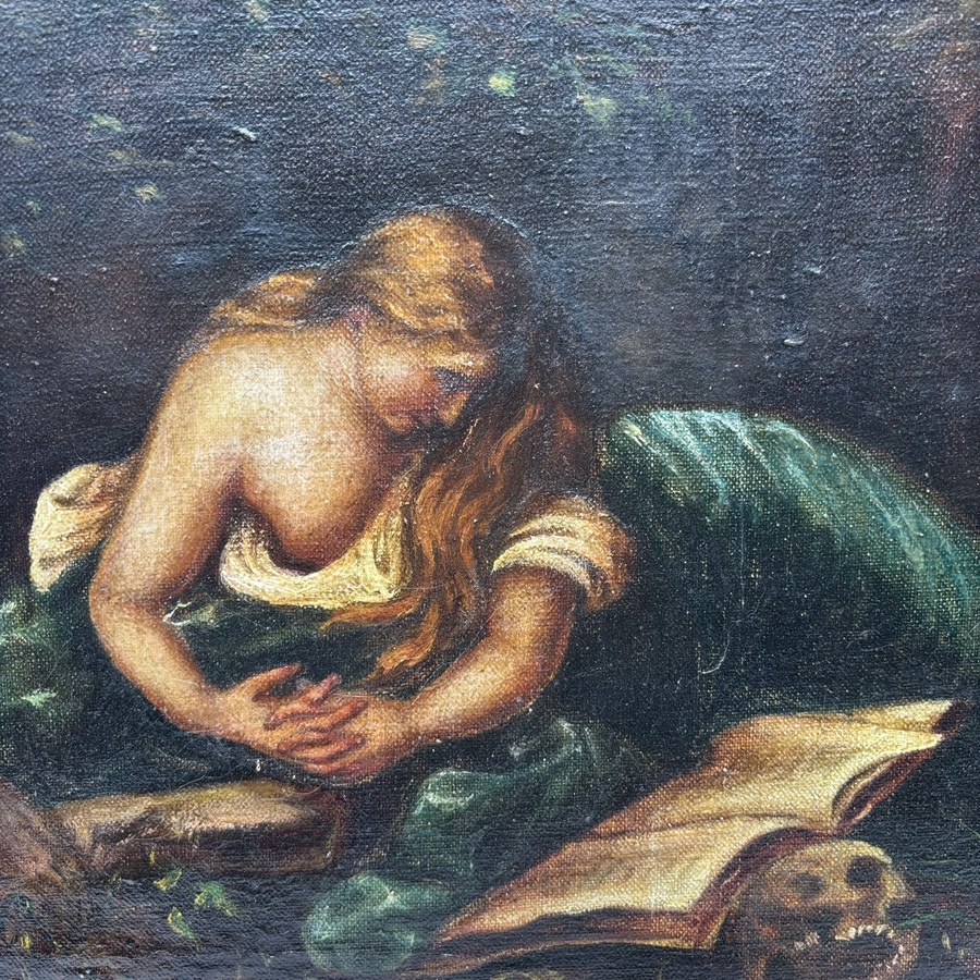 Schilderij, olieverf op doek. Voorstelling van een liggende, lezende Maria Magdalena. Ongesigneerd, Europese School 19e eeuw.