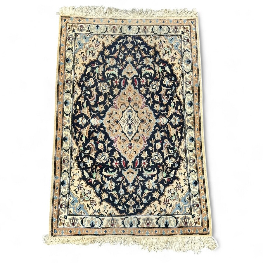 Een 20e eeuws wollen Perzisch tapijt in blauwe en beige tinten