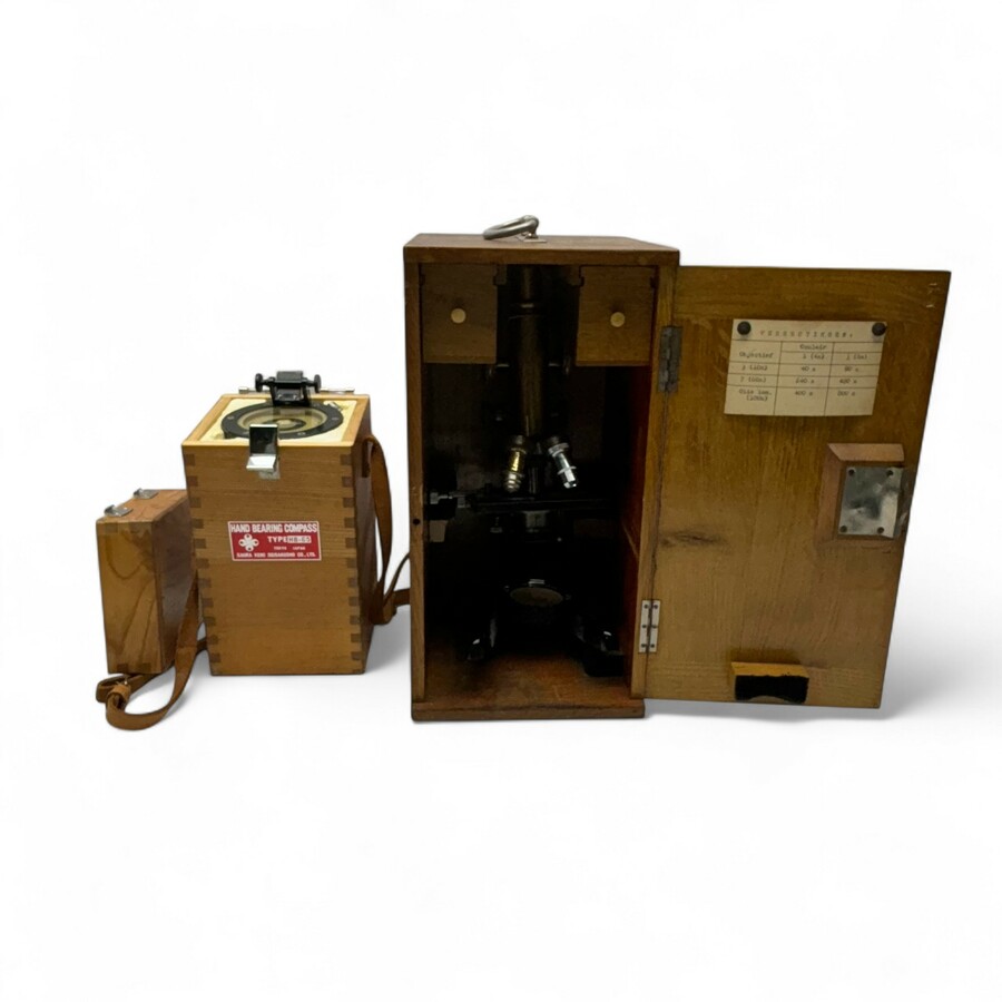 Een 20e eeuwse microscoop, met objectieven. Met daarbij een 20e eeuws handkompas, gemerkt 'Hand Bearing Compass Type HB-65'.