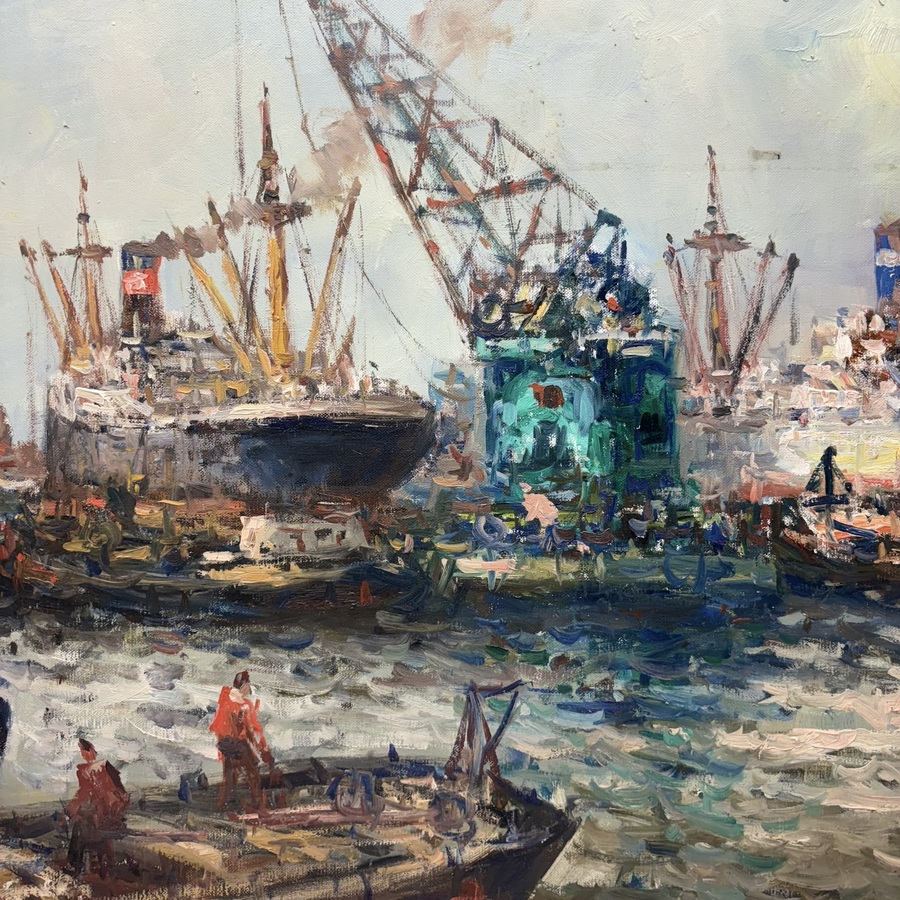 Schilderij, olieverf op doek. Havengezicht. Rechtsonder gesigneerd Wim Bos (Rotterdam 1906 - Den Haag 1974)