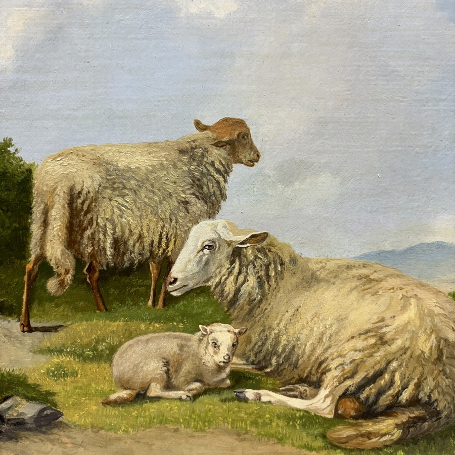 Schilderij, olieverf op doek, gemonteerd op paneel (marouflé). Twee schapen en een lammetje in berglandschap. Middenonder gesigneerd J. Heerman