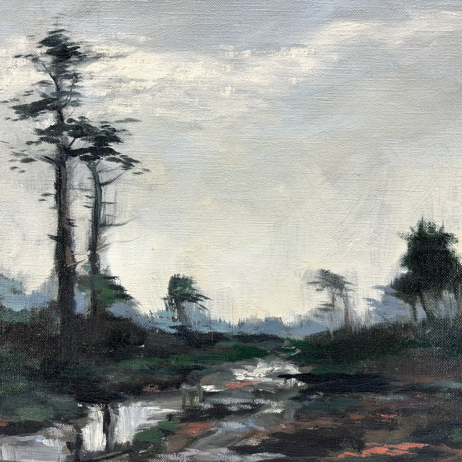 Schilderij, olieverf op doek. Natuurgebied, mogelijk de Peel in Limburg. Rechtsonder gesigneerd A. Maas, gedateerd 1979.