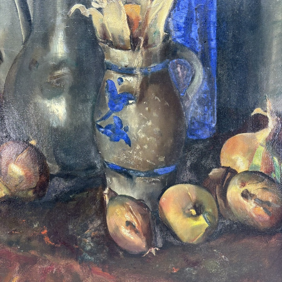 Schilderij, olieverf op doek. Stilleven met tinnen kruik, Keulse pot, blauwe fles en uien. Ongesigneerd werk van Piet Hanja (Tjimahi 1902 – Leeuwarden 1982). Herkomst: familie van de kunstenaar....
