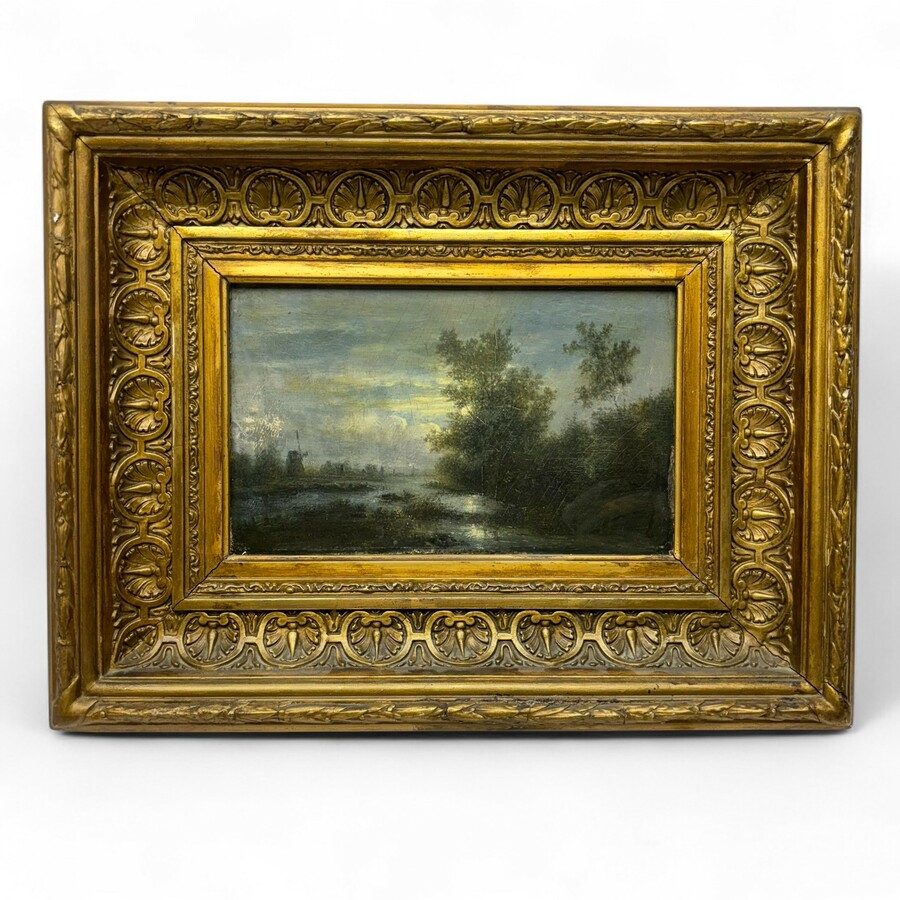 Schilderij, olieverf op paneel. Polderlandschap met molen bij maanlicht. Linksonder onduidelijk gesigneerd (J.H. Heiteman?) , Romantische School 19e eeuw.