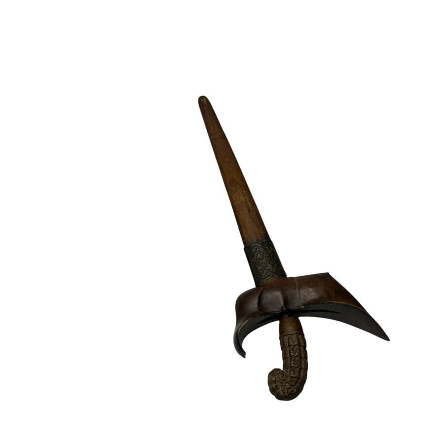Een antieke kris, Madoera, met houten bewerkte greep, schede met roodkoperen beperkt montuur, zonder mendak (tussenring).