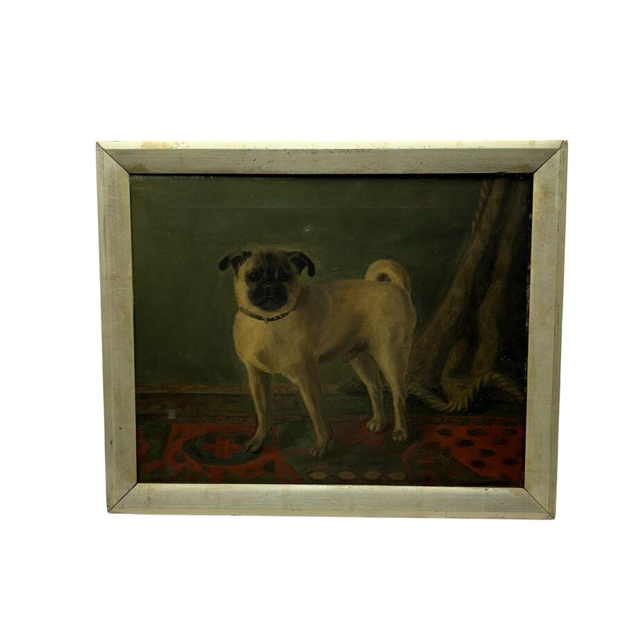 Schilderij, olieverf op doek. Portret van een mopshond. Ongesigneerd, Engelse School 19e/20e eeuw.