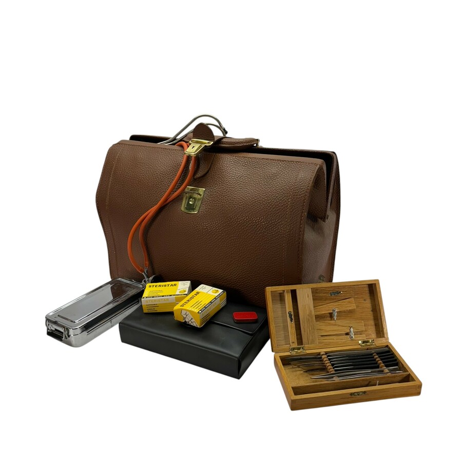 Een 20e eeuwse lederen dokterstas, gevuld met diverse inhoud